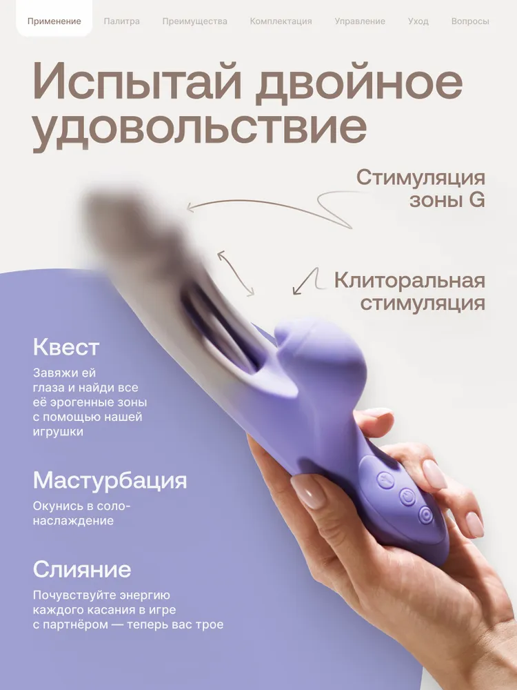 - Сочетает вибрацию, нежное похлопывание и подвижный язычок для клитора.