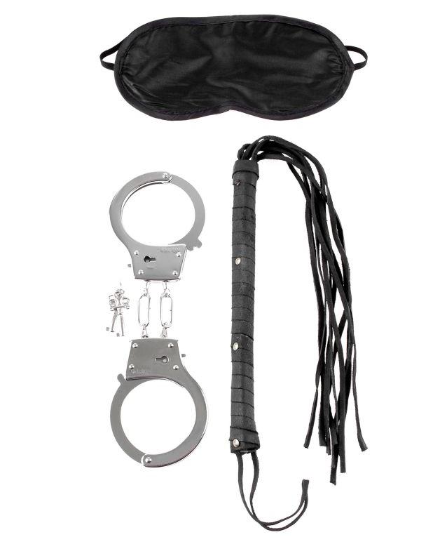БДСМ-набор Lover’s Fantasy Kit. Базовый набор для интересного вечера. В него входят: мягкая непрозрачная маска на глаза, мини-плетка для дразнящий стимуляции груди, половых губ или мошонки, а также классические металлические наручники на короткой сцепке (на случай потери ключей манжеты также оснащены быстросъемной защелкой).